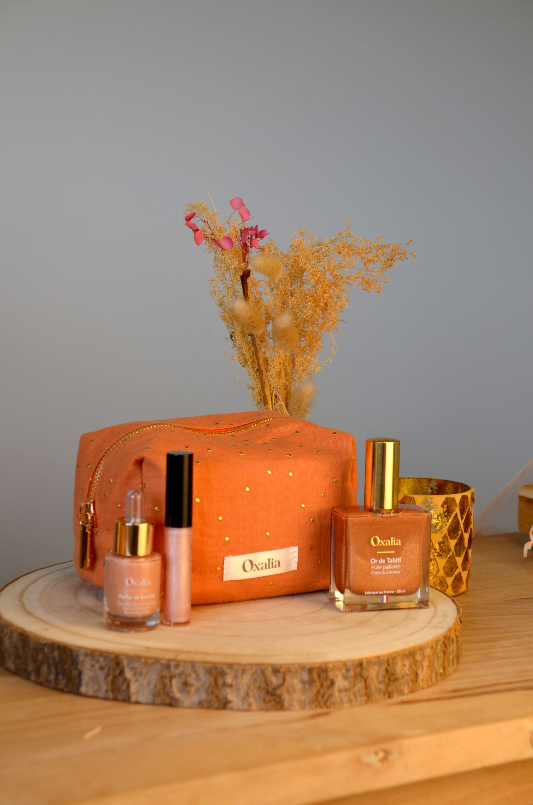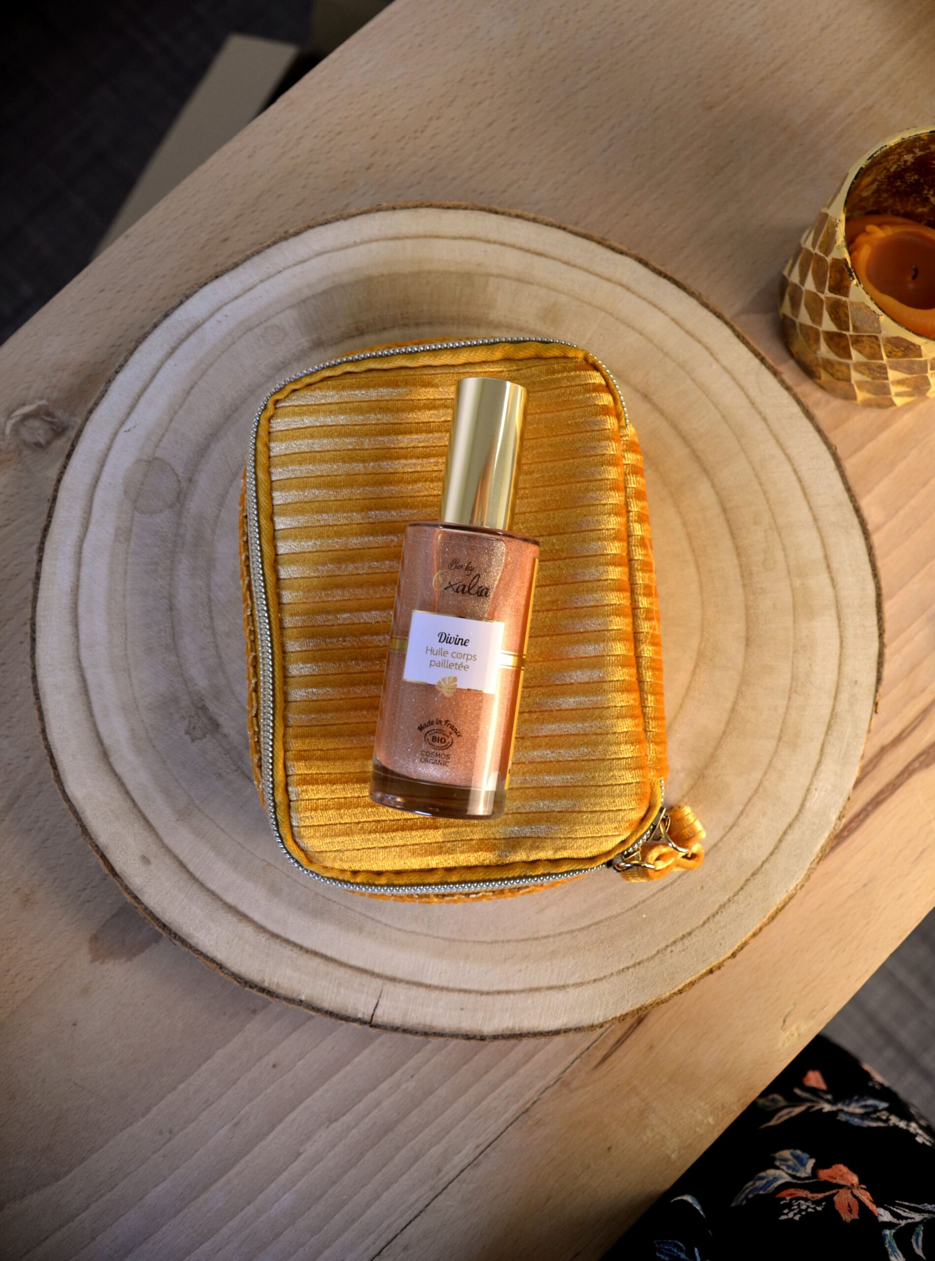 La trousse divine : Huile corps pailletée corps et cheveux et sa trousse dorée.